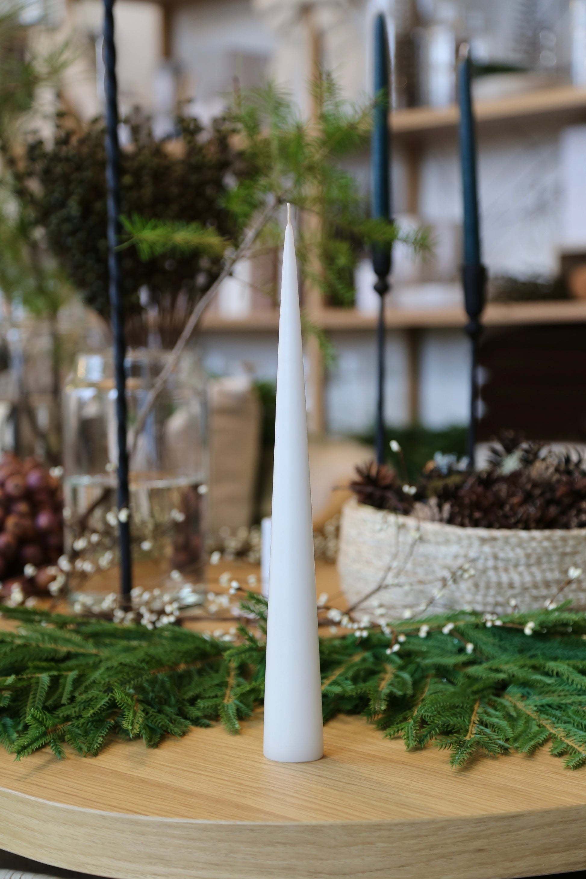 The cone candle is self-standing, making it a very versatile product. With its classic shape, it is elegant on its own, but it also sits beautifully on many other surfaces, for example a piece of glass, a raw cement table or a piece of marble – anything is possible, because no candle holder is required.
