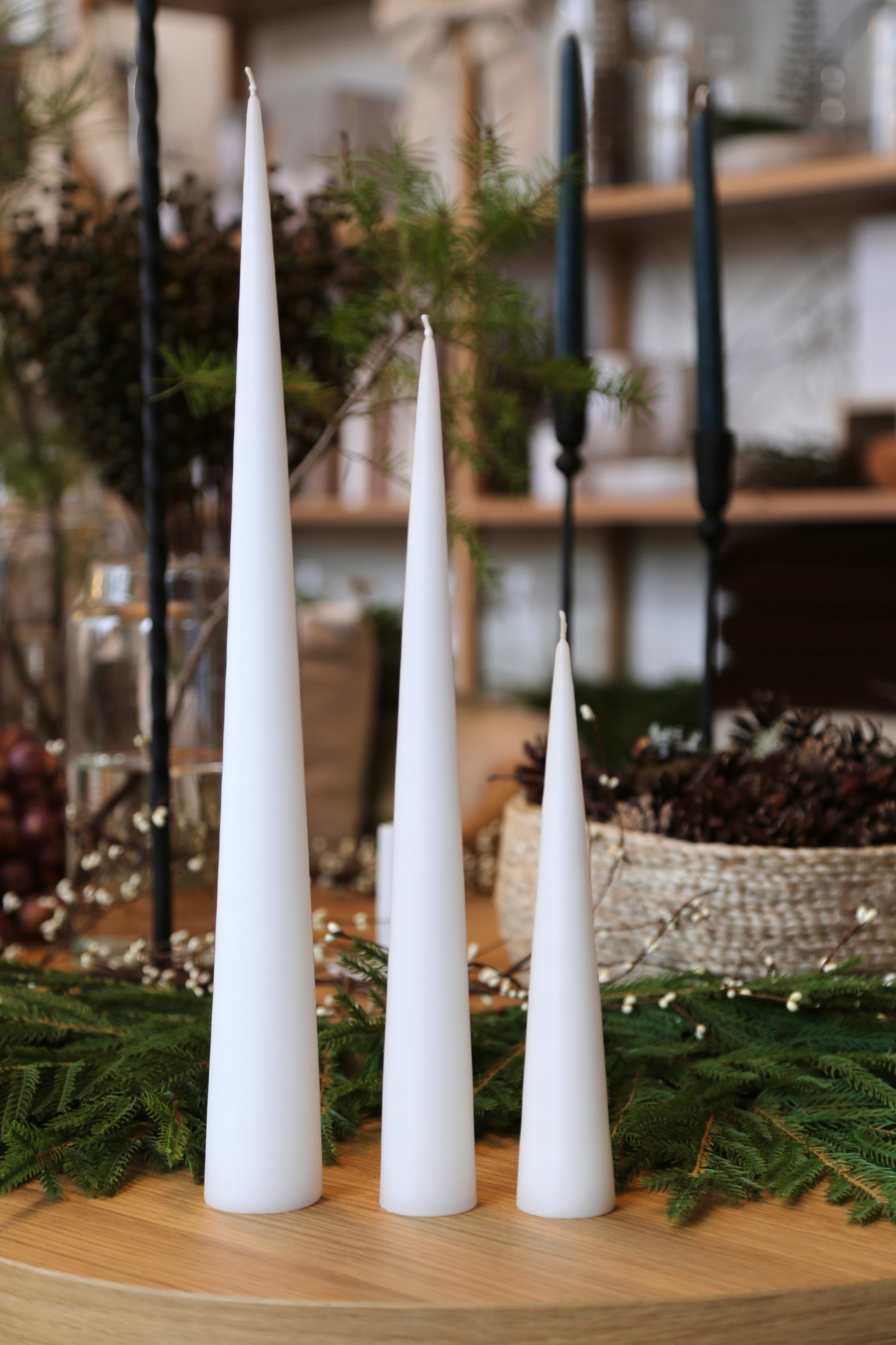 The cone candle is self-standing, making it a very versatile product. With its classic shape, it is elegant on its own, but it also sits beautifully on many other surfaces, for example a piece of glass, a raw cement table or a piece of marble – anything is possible, because no candle holder is required.