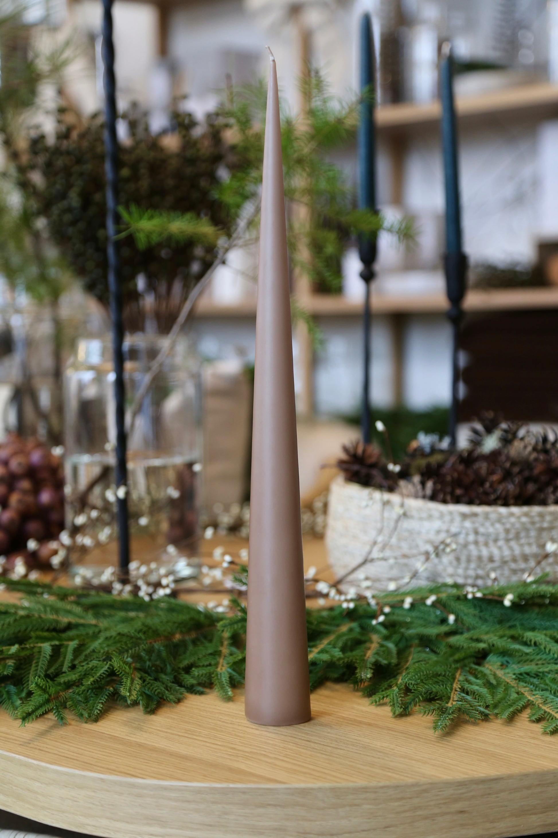 The cone candle is self-standing, making it a very versatile product. With its classic shape, it is elegant on its own, but it also sits beautifully on candle plates or many other surfaces, for example a piece of glass, a raw cement table or a piece of marble – anything is possible, because no candle holder is required.