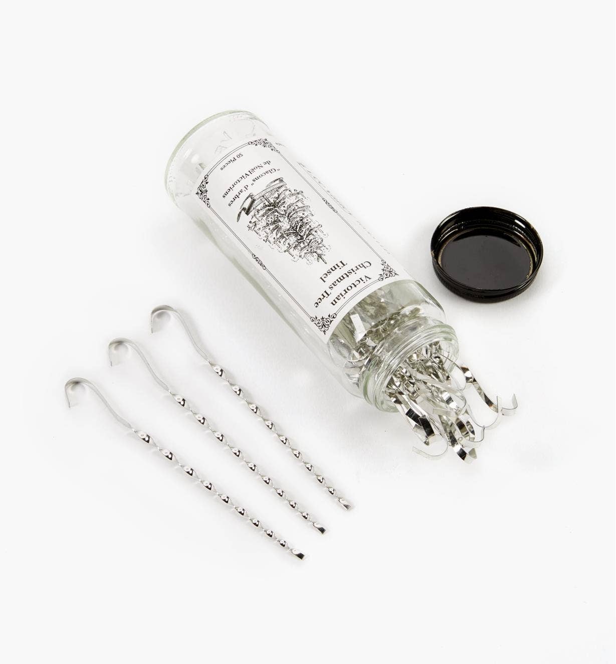 This timeless decoration adds a finishing touch to any tree. Each tube contains 50 pieces of five-and-a-half-inch long Victorian-style tinsel. We craft the tinsel from USA-made tin-plated steel at our small shop in Lancaster, Ontario, Canada. Each piece is made with an even twist to replicate the vintage-style tinsel that adorned trees during the holidays dating back to Victorian times. We hope you enjoy our product as much as we enjoy making it! *Packaged in a clear glass bottle with a black tin cap.